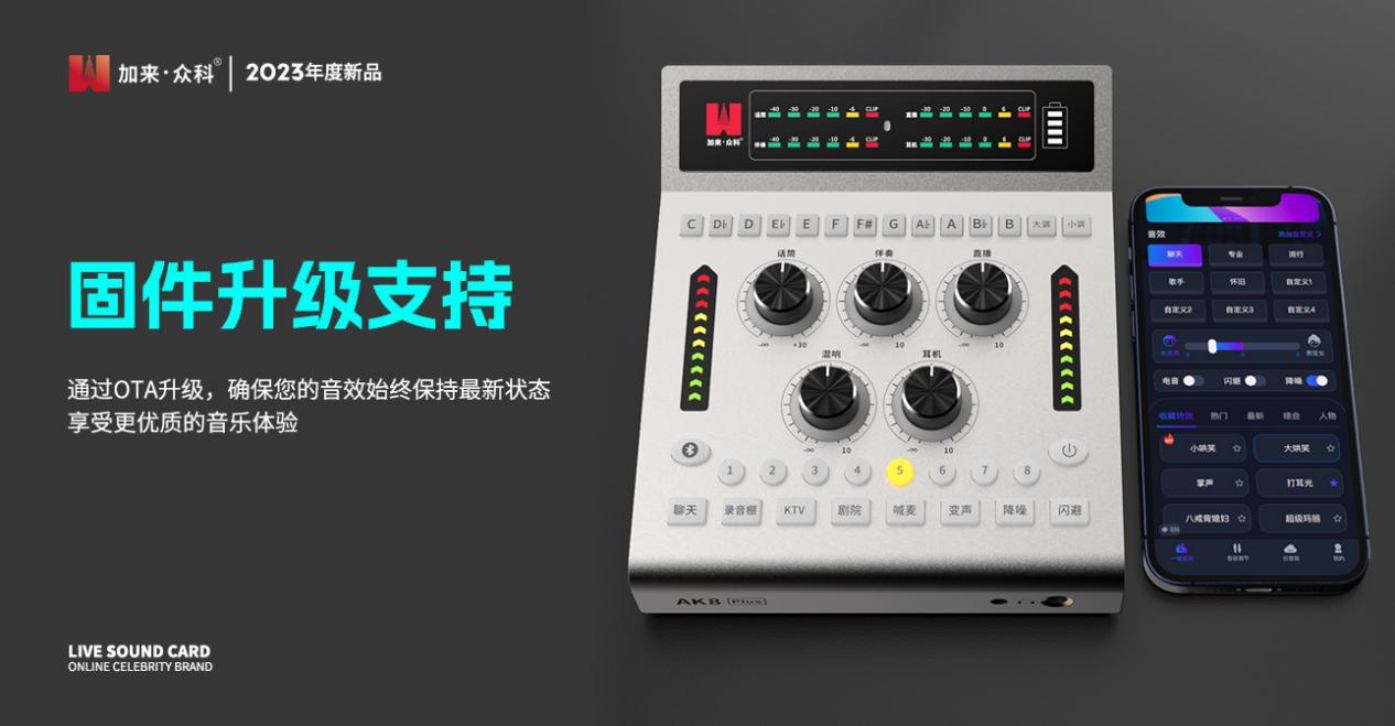 加来众科自2013年成立以来,一直致力于创新和卓越,产品在业内享誉盛名,畅销全球,备受赞誉!2023年,经过10年的技术积累和精益求精,加来众科荣耀推出十年磨一剑的AK8Plus直播声卡,它以其突破性的音质和稳定性能,以及创新性的声卡+手机(音效小程序),实现轻松打造高质量、全智能的直播间!点燃了直播与录音的新纪元!